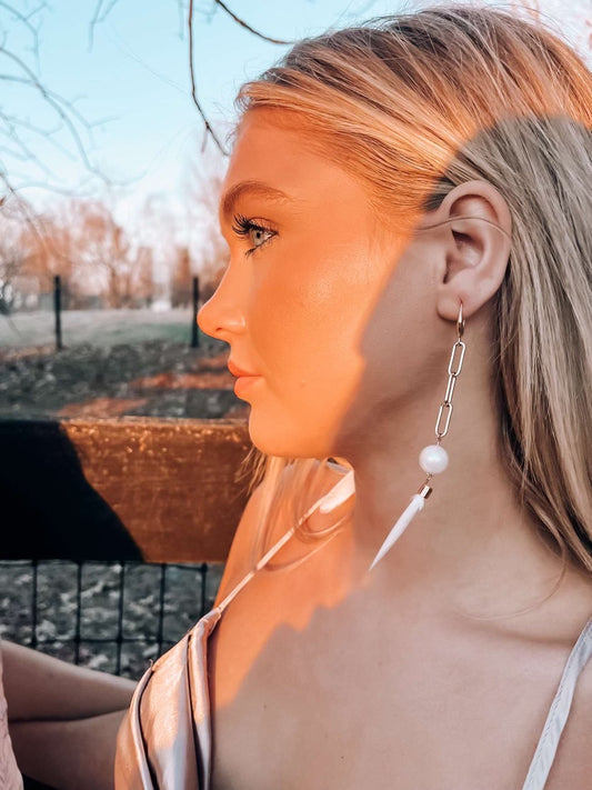 Double-sided White Dove Feathers & Pearls Dangling on Gold Links - Cruelty Free